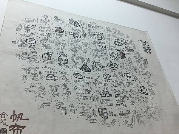 合成帆布行內,牆面上的臺南散步地圖,把一些景點用線稿的方式繪出,像孔廟、林百貨、文學館,還有其他老店,有點可愛。