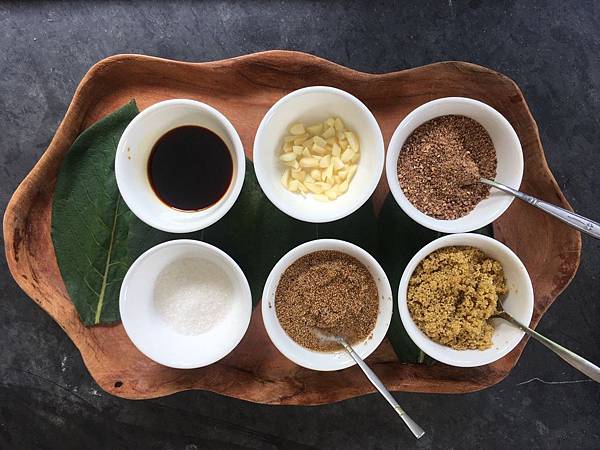 ▲吉拿富最重要的是肉的調味,闆娘把所有的調味料裝在自製的容器中逐一介紹(醬油/白糖/蒜頭/紅藜/小米/芋頭粉)