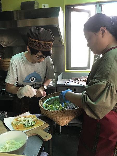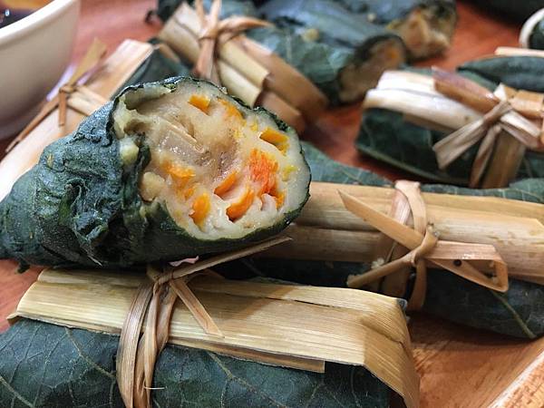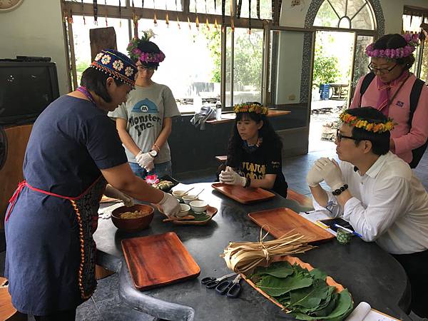▲大家開始動手包一口吉拿富,包完後用採下來的月桃葉繫緊,水中煮20分鐘就可以上桌