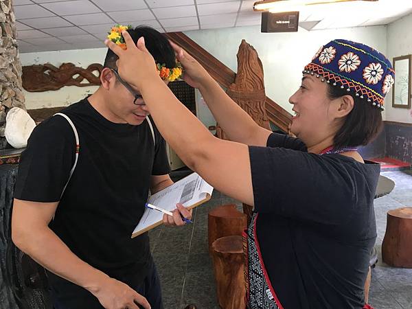▲拉瀑灣民宿老闆娘說:「歡迎貴賓來到拉瀑灣,幫你們戴上花圈代表歡迎你們來喔。」