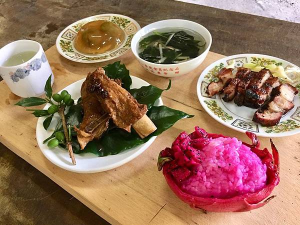 ▲【今日菜單】火龍果飯/路蕎咖啡烤肉/咖啡燉肋排/咖啡梅子凍/金銀花茶