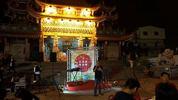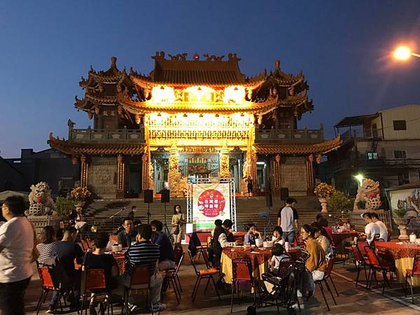 雖然夜幕垂下,超峰寺的燈一點亮,金黃色的燈光讓辦桌活動閃爍了起來