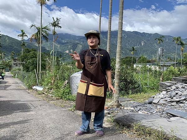 ▲ 闆娘美英姐身穿神山社區設計的《月亮圍裙》接待來訪的旅人